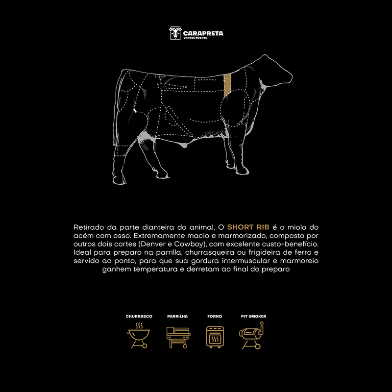 O Short Rib é uma verdadeira joia para os apaixonados por carne. Retirado da parte dianteira do miolo do acém com o osso da costela, esse corte premium reúne o melhor de dois mundos: a suculência e a presença do osso do Cowboy Steak com a maciez e marmoreio do Denver Steak. Essa combinação entrega sabor profundo e textura incomparável.