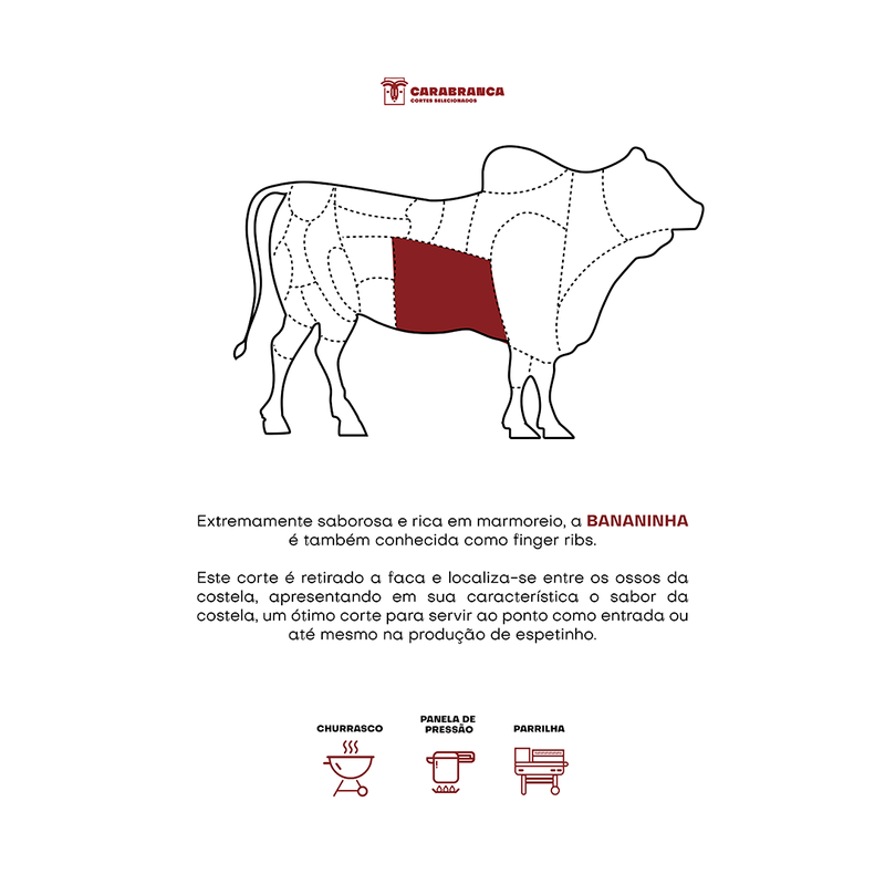A Bananinha CARABRANCA é um recorte especial retirado da parte inferior do contrafilé do boi Nelore, a raça que é símbolo da pecuária nacional. Por estar próximo da costela, essa região concentra fibras curtas e uma generosa camada de gordura entremeada, garantindo suculência e um sabor marcante.
