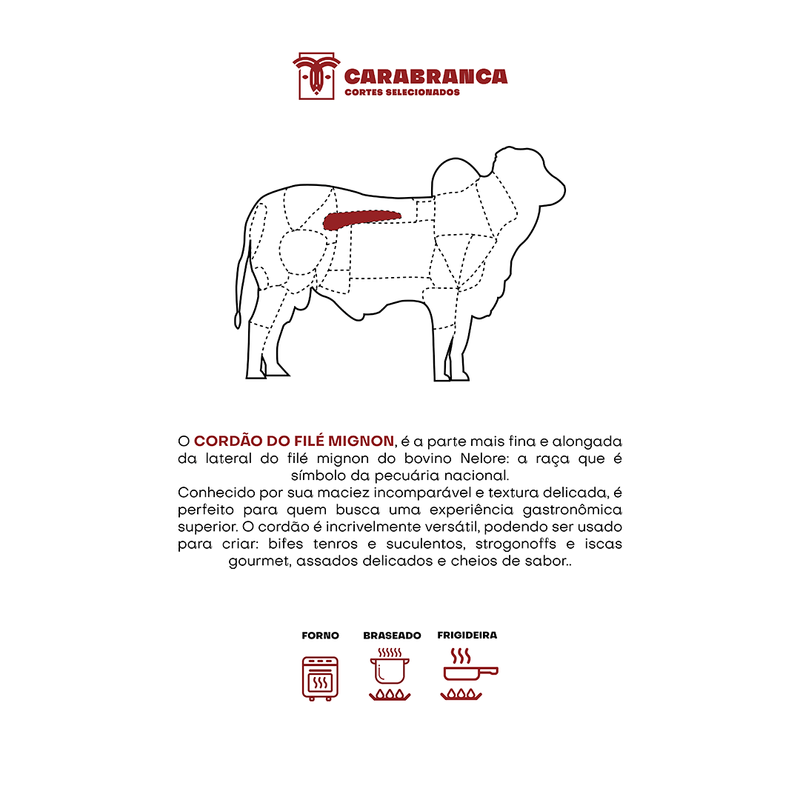 O Cordão do Filé Mignon CARABRANCA, é a parte mais fina e alongada da lateral do filé mignon do bovino Nelore: a raça que é símbolo da pecuária nacional.