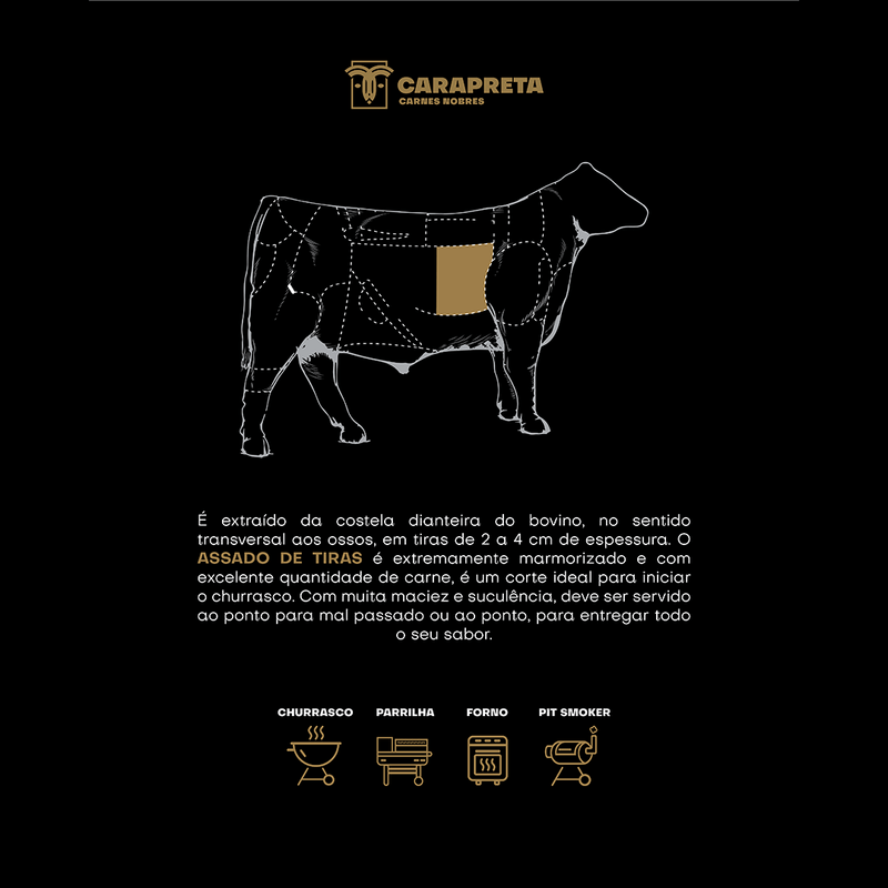 O Assado de Tira Wagyu, é um corte proveniente das costelas do dianteiro do boi Wagyu, serradas em tiras com os ossos na transversal. Por ser um corte premium é extremamente saboroso e suculento, é perfeito para churrasco, sendo de fácil preparo. Este corte é ideal para aqueles que procuram uma experiência culinária premium. (Produto Congelado-Peso Médio: 0,800g. Obs: o peso deste produto pode variar entre 0,700g e 0,900g).