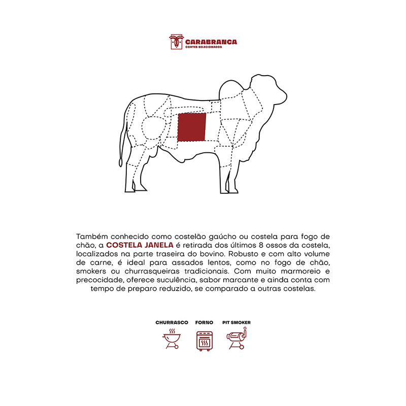 Também chamado de costelão gaúcho ou costela para fogo de chão, é referente aos últimos 8 ossos da costela, localizado na parte traseira, na lateral do boi Nelore: a raça que é símbolo da pecuária nacional. É um corte robusto e com alto volume de carne; indicada para assados lentos como fogo de chão, smokers e churrasqueira. Tem o tempo de preparo mais lento.