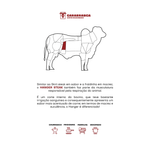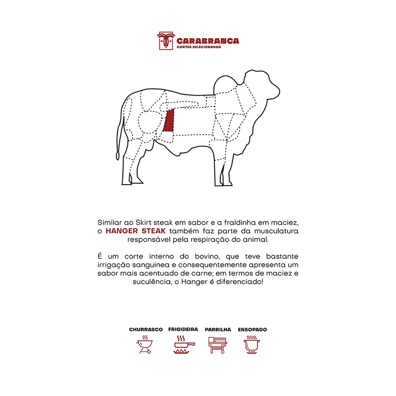 Também conhecido como bife de cabide, o Hanger Steak CARABRANCA é um corte retirado do diafragma do boi Nelore (a raça que é símbolo da pecuária nacional), entre o lombo e a costela — bem próximo do filé mignon, o que explica sua maciez surpreendente. Possui fibras longas e um sabor marcante.