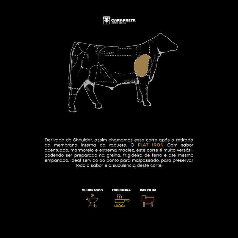 Um dos grandes sucessos entre os cortes do dianteiro, o Flat Iron Angus Carapreta. Sabor intenso e versatilidade. Para servir, acompanhe com um delicioso chimichurri. É um corte retirado da PALETA, sem capa de gordura, e um dos cortes mais macios do bovino, ideal servido ao ponto mal ou mal passado.