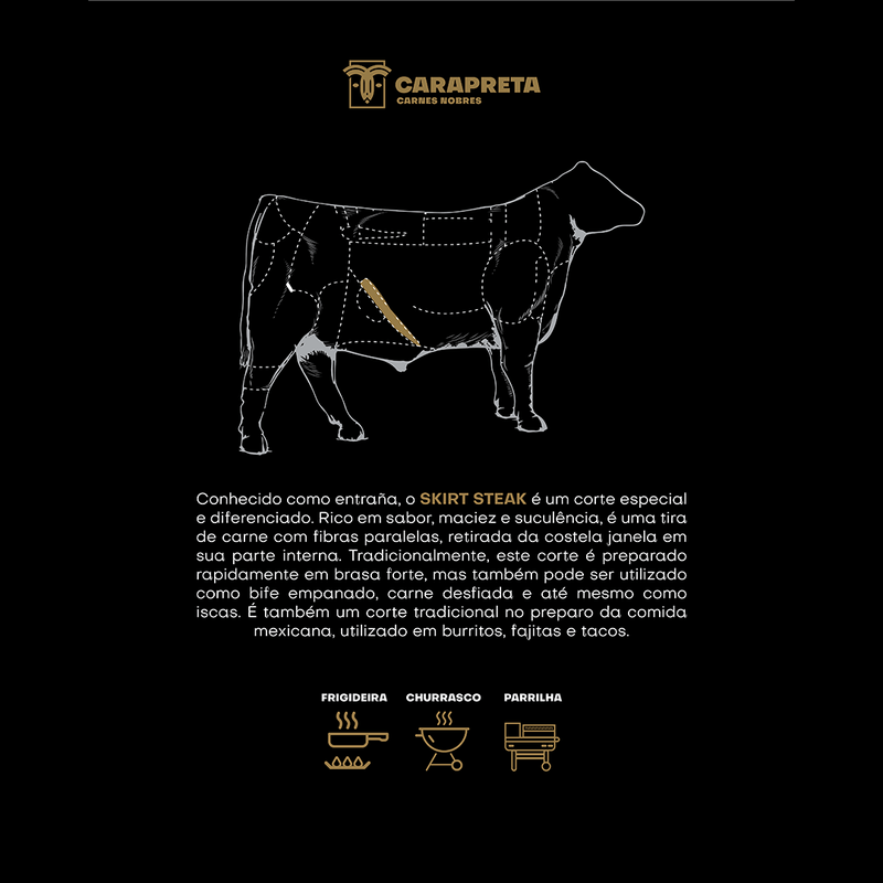 Sabor único e maciez inigualável, apresentamos o Skirt Steak. Um dos cortes mais valorizados pelos nossos Hermanos Uruguaios e Argentinos. Também conhecido como entranha, é uma excelente entrada para um churrasco no padrão CARAPRETA.